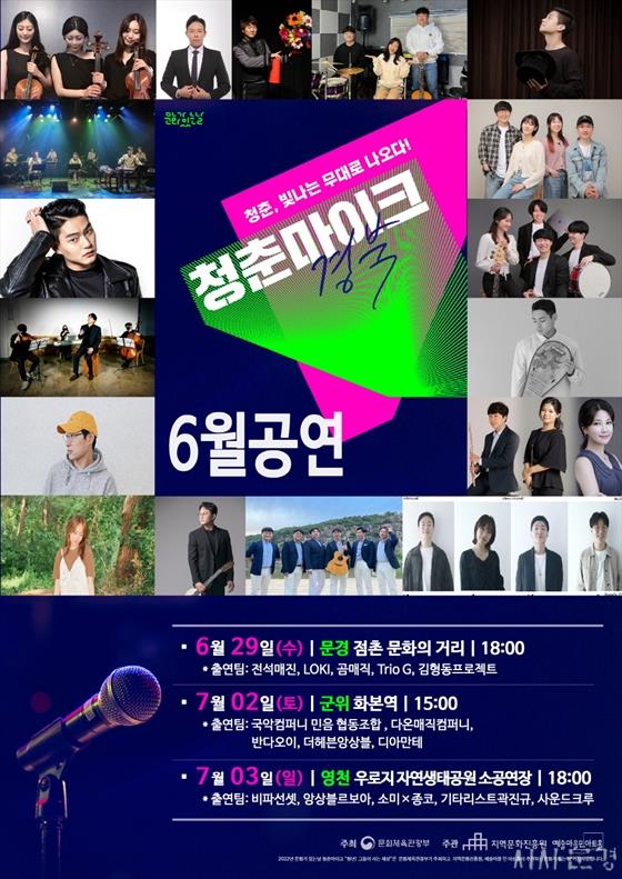 6¿ù 29ÀÏ ¼ö¿äÀÏ¿¡´Â ¹®°æ½Ã ¡®Á¡ÃÌ ¹®ÈÀǰŸ®¡¯¿¡¼ Àü¼®¸ÅÁø, LOKI, °õ¸ÅÁ÷, Trio G, ±èÇüµ¿ ÇÁ·ÎÁ§Æ®°¡ °ø¿¬À» Çϸç, Äڷγª 19·Î ÁöÃÄÀÖ´ø Áö¿ªÁֹεéÀ» À§ÇØ Ã»ÃḶÀÌÅ© °æºÏ±Ç û³â¿¹¼ú°¡µéÀÇ ¸ÚÁø ¹«´ë°¡ ±â´ëµÈ´Ù. 2022 ûÃḶÀÌÅ© °æºÏ±Ç »ç¾÷ Àü¹Ý¿¡ °ü·ÃÇÑ »çÇ×Àº ¿¹¼ú¸¶À» ¹Î ¾ÆÆ®È¦(www.artvip.co.kr) ȨÆäÀÌÁö¸¦ ÅëÇØ ÀÚ¼¼È÷ ¾È³»¹ÞÀ» ¼ö ÀÖ´Ù.