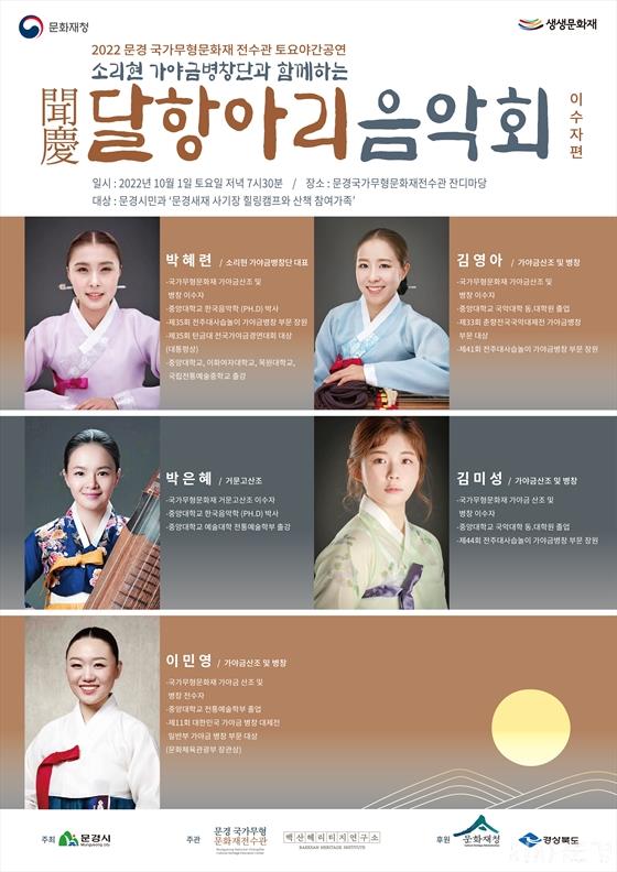 Áö³ 10¿ù 1ÀÏ Åä¿äÀÏ ¹ã¿¡ ¹®°æ ±¹°¡¹«Çü¹®ÈÀçÀü¼ö°ü Àܵ𸶴翡 ¼Ò¸®²Û 6¸íÀÌ Çѵ¥ ¸ð¿© ÆîÄ¡´Â ¡®°æ»ç½º·¯¿î ´ÞÀÇ ¼Ò¸®¸¦ µè´Ù: ¹®°æ¡¤MoonÌÔ ´ÞÇ׾Ƹ® À½¾Çȸ¡¯°¡ ²Ù¸çÁ³´Ù.
