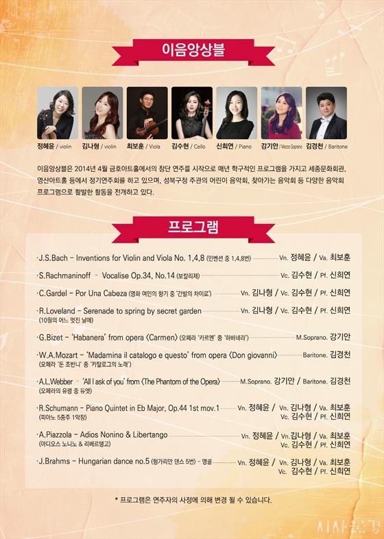 ÀÌÀ½¾Ó»óºíÀº 2014³â 4¿ù ±ÝÈ£¾ÆÆ®È¦¿¡¼ÀÇ Ã¢´Ü ¿¬ÁÖ¸¦ ½ÃÀÛÀ¸·Î ¸Å³â Çб¸ÀûÀÎ ÇÁ·Î±×·¥À» °¡Áö°í ¼¼Á¾¹®Èȸ°ü, ¿µ»ê¾ÆÆ®È¦ µî¿¡¼ Á¤±â¿¬ÁÖȸ¸¦ Çϰí ÀÖÀ¸¸ç, ¼ººÏ±¸Ã» ÁÖ°üÀÇ ¾î¸°ÀÌ À½¾Çȸ, Å뿵±¹Á¦À½¾ÇÁ¦ ÇÁ¸°ÁöÄܼƮ, ÀÓ»êºÎ¸¦ À§ÇÑ Èú¸µ À½¾Çȸ µî ´Ù¾çÇÑ À½¾Çȸ ÇÁ·Î±×·¥À¸·Î Ȱ¹ßÇÑ È°µ¿À» Àü°³Çϰí ÀÖ´Ù.