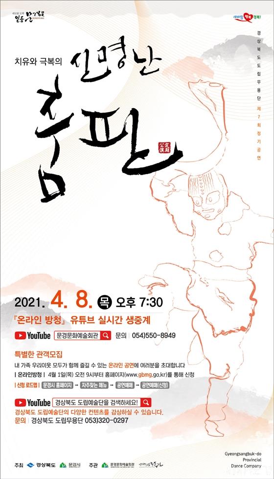 ¹®°æ½Ã ¹®È¿¹¼úȸ°üÀº °æºÏµµ¸³¹«¿ë´Ü Á¦7ȸ Á¤±â°ø¿¬ Ä¡À¯¿Í ±Øº¹ÀÇ ¡®½Å¸í³ ÃãÆÇ¡¯À» ¿À´Â 4¿ù 8ÀÏ ¿ÀÈÄ 7½Ã 30ºÐ ´ë°ø¿¬Àå¿¡¼ À¯Æ©ºê ½Ç½Ã°£ »ýÁß°è(ä³Î¸í: ¹®°æ¹®È¿¹¼úȸ°ü, °æ»óºÏµµ µµ¸³¿¹¼ú´ÜTV)·Î ÁøÇàÇÑ´Ù.