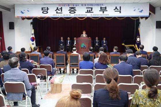 ¹®°æ½Ã¼±°Å°ü¸®À§¿øÈ¸(À§¿øÀå Ȳ¼º¿í)´Â 6¿ù 15ÀÏ ¹®°æ½Ãû ´ëȸÀǽǿ¡¼ Áö³ 13ÀÏ Áö¹æ¼±°Å¿¡¼ ´ç¼±µÈ °íÀ±È¯ ¹®°æ½ÃÀå ´ç¼±ÀÎÀ» ºñ·ÔÇØ µµÀÇ¿ø°ú ½ÃÀÇ¿ø ´ç¼±Àΰú °¡Á· µî 100¿©¸íÀÌ Âü¼®ÇÑ °¡¿îµ¥ ÀÖ¾ú´Ù.