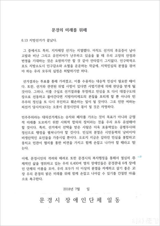 ¹®°æ½ÃÀå¾ÖÀδÜü¿¡¼­ ¡°»ç¹ý±â°üÀÇ ¼ö»ç¸¦ ±¸½Ç·Î ¼±°Å°á°ú¸¦ ºÎÁ¤ÇÏÁö ¸»°í ¹®°æÀÇ ¹Ì·¡¸¦ À§ÇØ È­ÇÕÇ϶󡱴 ¼º¸í¼­¸¦ ¹ßÇ¥Çß´Ù.