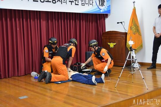 ¹®°æ¼Ò¹æ¼ ½Ã¿¬È¸ ÆÀÀº ½ÉÀμº½ÉÁ¤Áö »ç·Ê¸¦ À籸¼ºÇØ È¯ÀÚ ¹ß»ý ½Ã 119½Å°í Á¢¼öºÎÅÍ ±¸±Þ´ë°¡ Ã⵿ÇÏ¿© º´¿ø Àü ±îÁö ÆÀCPR(½ÉÆó¼Ò»ý¼ú)°ú Àü¹®ÀÀ±Þóġ ½Ã¿¬À» ÇÏ¿´À¸¸ç ½Ã¿¬È¸¸¦ ¸¶Ä£ ÈÄ Á÷¿ø »óÈ£°£ ½ÉÁ¤Áö ȯÀÚ ¼Ò»ý·ü Çâ»óÀ» À§ÇÑ ¿¶í Åä·ÐÀ» ÆîÃÆ´Ù.