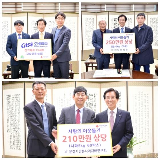 ºÓ°Ô ¹°µç °¡À», ¹®°æ½Ã¿¡´Â ¾î·Á¿î ÀÌ¿ôÀ» µ½±â À§ÇØ Çö¹° ±âŹÀÌ À̾îÁö°í ÀÖ´Ù. ¹®°æÃà»ê³óÇù¿¡¼ ¿¬Åº 2¸¸Àå¿¡ ÀÌ¾î ¿Àºñ¸ÆÁÖ ¾Èµ¿ÁöÁ¡¿¡¼´Â Àü±âÀåÆÇ 13¼¼Æ®(200¸¸¿ø »ó´ç), µÎ¿ø½Äǰ ¹× ´Ù¸ð¾ÆÁ¶°æ¿¡¼´Â ½Ò 10kg 100Æ÷(250¸¸¿ø »ó´ç), ¹®°æ½Ã°¨È«»ç°úÀç¹è¿¬±¸È¸¿¡¼ »ç°ú 5kg 60¹Ú½º(200¸¸¿ø »ó´ç)À» ¹®°æ½Ã¿¡ ±âŹÇß´Ù.