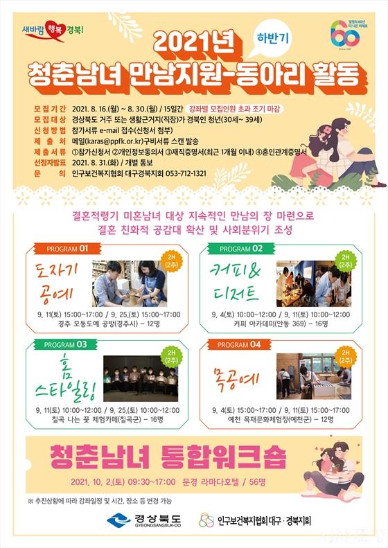 ¡®ÇϹݱâ ûÃá³²³à ¸¸³²Áö¿ø(µ¿¾Æ¸®) »ç¾÷¡¯Àº °áÈ¥ Àû·É±â ¹ÌÈ¥ ³²³à¸¦ ´ë»óÀ¸·Î µµÀڱ⠰ø¿¹, Ä¿ÇÇ¿Í µðÀúÆ®, Ȩ½ºÅ¸Àϸµ, ¸ñ°ø¿¹ µî ÃÑ 4°³ Ŭ·¡½º·Î °æÁÖ¡¤¾Èµ¿¡¤Ä¥°î¡¤¿¹Ãµ¿¡¼ 2ÁÖ°£ °¢ 12~16¸í¾¿ µ¿¾Æ¸®¸¦ ±¸¼ºÇØ È°µ¿ÇÑ´Ù.