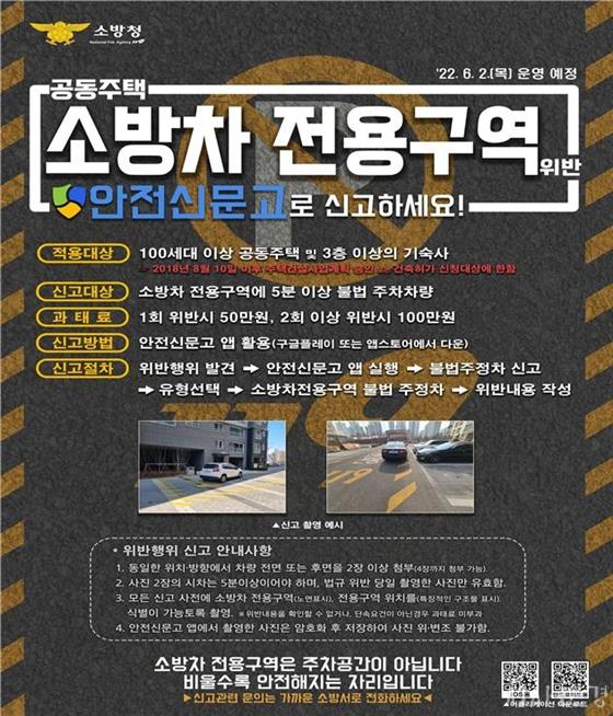 6¿ù 2ÀϺÎÅÍ ¾ÈÀü½Å¹®°í ¾Û¿¡´Â ¡®¼Ò¹æÂ÷ Àü¿ë±¸¿ª ÁÖÂ÷ À§¹ÝÂ÷·® µî¡¯À» ½Å°íÇÒ ¼ö ÀÖ´Â ¸Þ´º°¡ Ãß°¡µÈ´Ù. ½Å°í ´ë»óÀº 2018³â 8¿ù 10ÀÏ ÀÌÈÄ ÁÖÅðǼ³»ç¾÷°èȹ ½ÂÀÎ ¶Ç´Â °ÇÃàÇã°¡ ½Åû´ë»ó Áß 100¼¼´ë ÀÌ»óÀÇ °øµ¿ÁÖÅðú ±â¼÷»çÀÇ ¼Ò¹æÂ÷ Àü¿ë±¸¿ª¿¡ ºÒ¹ý ÁÖÂ÷ÇÑ Â÷·®ÀÌ´Ù.
