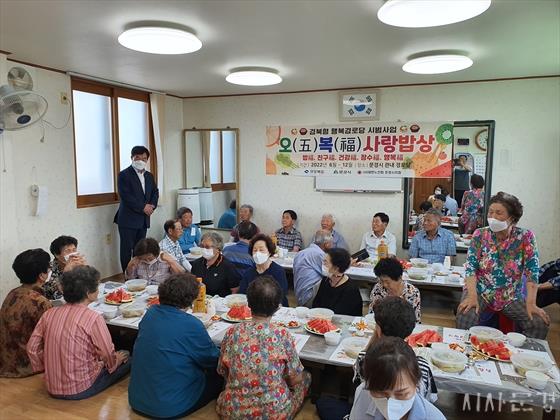 ÇÑÆí À̳¯ ¸ðÀüÁ¦Àϰæ·Î´ç¿¡¼´Â ¾à 30¸íÀÇ ¾î¸£½ÅÀÌ ¸ðÀÎ °¡¿îµ¥ °íÁ¤È¯ ÁöȸÀå°ú ³²»ó¿í Á¡ÃÌ5µ¿Àå, ¼ÛÈñ¿µ ³ëÀÎÀå¾ÖÀκ¹Áö°úÀåÀÌ ¹æ¹®ÇØ ¾î¸£½ÅµéÀ» °Ý·ÁÇϰí ÇÔ²² ½Ä»çÇß´Ù.