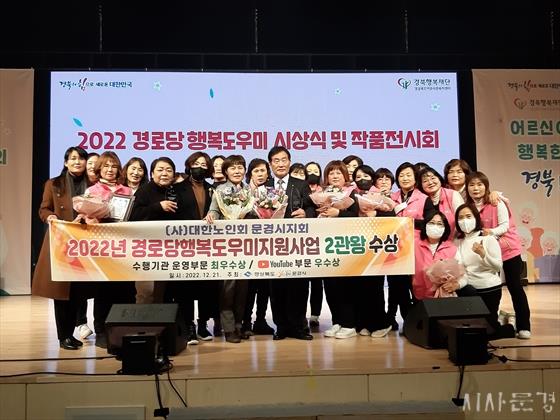 (»ç)´ëÇѳëÀÎȸ ¹®°æ½ÃÁöȸ(ÁöȸÀå °íÁ¤È¯)´Â 2022³â °æ·Î´çÇູµµ¿ì¹ÌÁö¿ø»ç¾÷ ¼öÇà±â°ü ¿î¿µ ºÎ¹® ÃÖ¿ì¼ö»ó, À¯Æ©ºê ºÎ¹® ¿ì¼ö»óÀ» ¼ö»óÇÏ´Â ¿µ±¤À» ¾È¾Ò´Ù. ¶ÇÇÑ, ÇÁ·Î±×·¥ ÄÚµð³×ÀÌÅÍ ºÎ¹®¿¡¼ ÀüÇö°æ¾¾°¡ µµÁö»çǥâ, ¼ö±â °ø¸ðÀü¿¡¼ ¾È¿µ¼÷ ¾î¸£½ÅÀÌ ÃÖ¿ì¼ö, ½ÅÈ½Ä ¾î¸£½ÅÀÌ ÀÔ¼±À» ÇÏ´Â °ã°æ»ç¸¦ ¸Â¾Ò´Ù.