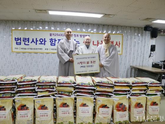 ´ëÇѺұ³Á¶°èÁ¾ ¹ý·Ã»ç(ÁÖÁö Áø°æ½º´Ô)°¡ Áö³­ 2¿ù 25ÀÏ ¼Ò¿ÜµÈ ÀÌ¿ôµéÀ» µ½±â À§ÇØ ´ëÇѺұ³Á¶°èÁ¾»çȸº¹ÁöÀç´Ü(´ëÇ¥ÀÌ»ç ¿øÇེ´Ô)¿¡ ÀÚºñÀÇ ½Ò 10kg ¹é¹Ì 100Æ÷¸¦ Àü´ÞÇß´Ù.