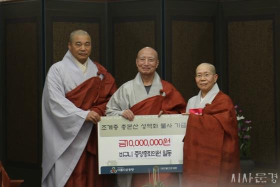 ´ëÇѺұ³ Á¶°èÁ¾ ºñ±¸´Ï Áß¾ÓÁ¾È¸ÀÇ¿ø ½º´Ôµé°ú ¿øÁÖ Ã»¸²»ç ÁÖÁö û¸²½º´ÔÀÌ Áö³­ 1¿ù 4ÀÏ ¼º¿ªÈ­ºÒ»ç±â±Ý°ú ¾ÆÇÁ¸®Ä« źÀÚ´Ï¾Æ º¸¸®°¡¶÷³ó¾÷±â¼ú´ëÇÐ ¹ßÀü±â±ÝÀ¸·Î °¢ °¢ 1,000¸¸ ¿øÀ» Àç´Ü¹ýÀÎ ¾Æ¸§´Ù¿îµ¿Çà(ÀÌ»çÀå ¼³Á¤½º´Ô)¿¡ Àü´ÞÇß´Ù.