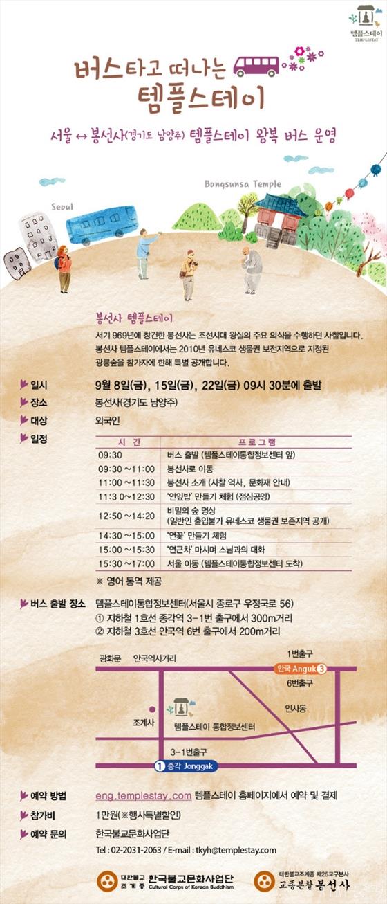 15ÀÏ(±Ý), 22ÀÏ(±Ý) ¿ÀÀü 9½Ã 30ºÐ ÅÛÇýºÅ×ÀÌÅëÇÕÁ¤º¸¼¾ÅÍ(¼­¿ï Á¾·Î±¸)¸¦ Ãâ¹ßÇØ ºÀ¼±»ç(°æ±âµµ ³²¾çÁÖ) ÅÛÇýºÅ×À̸¦ üÇèÇÏ´Â ÀÏÁ¤À¸·Î ÅÛÇýºÅ×ÀÌ °ø½Ä ȨÆäÀÌÁö(eng.templestay.com)¿¡¼­ ¿¹¾àÇÒ ¼ö ÀÖÀ¸¸ç, Âü°¡ºñ´Â Çà»ç±â°£ 1¸¸¿øÀÌ´Ù.
