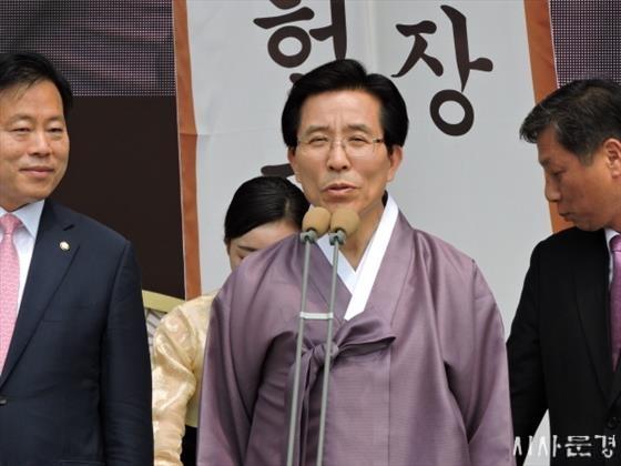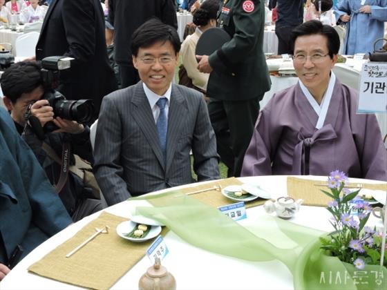 | °íÀ±È¯ ½ÃÀå°ú ÃÖ±³ÀÏ ±¹È¸ÀÇ¿ø ´ç¼±ÀÚ°¡ Çìµå Å×ÀÌºí¿¡ ³ª¶õÈ÷ ¾É¾Æ ´ã¼Ò¸¦ ³ª´©°í ÀÖ´Ù. |