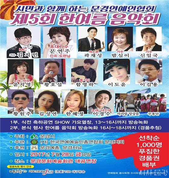 Á¦5ȸ ¹®°æ½Ã¹Î ÇÑ¿©¸§ À½¾Çȸ°¡ ¿¬¿¹ÀÎÇùȸ ¹®°æ½ÃÁöºÎ ÁÖÃÖ·Î ¿À´Â 7¿ù 28ÀÏ ¹®È¿¹¼úȸ°ü ´ë°ø¿¬Àå¿¡¼ ¿ÀÈÄ 1½ÃºÎÅÍ ¿¸°´Ù.