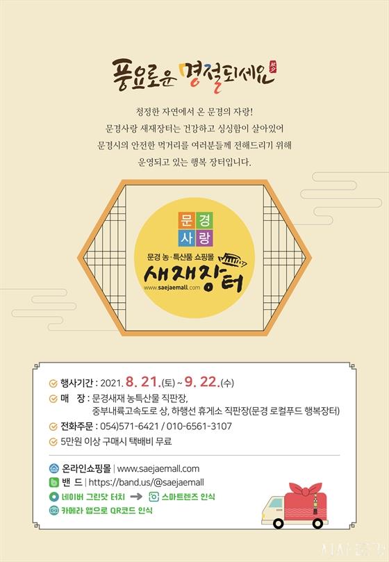 ¹®°æ°ü±¤ÁøÈï°ø´Ü(ÀÌ»çÀå ±Ý¿Á°æ) ³óƯ»ê¹°Á÷ÆÇÀåÀº ¹®°æ»õÀçÁ÷ÆÇÀå, Áߺγ»·ú°í¼Óµµ·Î ¹®°æ »ó¡¤ÇÏÇ༱ ÈÞ°Ô¼ÒÁ÷ÆÇÀå°ú ÀÎÅͳݼîÇθô ¡®¹®°æ»ç¶û»õÀçÀåÅÍ(www.saejaemall.com)¡¯¿¡¼ 9¿ù 22ÀϱîÁö ¡®Ãß¼®¸ÂÀÌ Æ¯º° ÇÒÀÎÆÇ¸ÅÇà»ç¡¯¸¦ ½Ç½ÃÇÑ´Ù°í ¹àÇû´Ù.