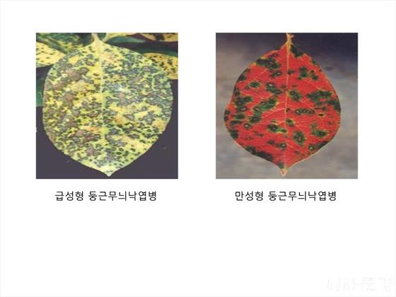 ¸¸¼ºÇü µÕ±Ù¹«´Ì³«¿±º´Àº 9¿ù Áß¼øºÎÅÍ ¹ß»ýÇϱ⠽ÃÀÛÇØ º´¹ÝºÎ ¾ÈÂÊÀÌ Àû°¥»ö, ÁÖÀ§´Â °ËÀº»ö ¶ì°¡ ³ªÅ¸³ª´Â µ¥ ¿À·¡µÇ¸é ³ì»öÀÇ ¶ì·Î º¯Çϰí ÁÖÀ§´Â ¼¼È÷ ºÓÀº»öÀ¸·Î ¹øÁö¸é¼ ÀÙÀÌ ¶³¾îÁø´Ù.