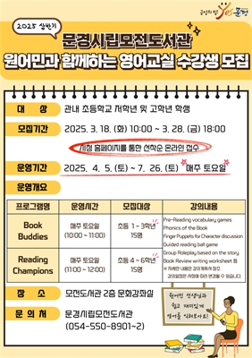(¿ø¾î¹Î°ú ÇÔ²²ÇÏ´Â ¿µ¾î±³½Ç)¹®°æ½Ã¸³¸ðÀüµµ¼­°üÀº 4¿ù 5ÀϺÎÅÍ 7¿ù 26ÀϱîÁö ¸ÅÁÖ Åä¿äÀÏ ÃʵîÇлýÀ» À§ÇÑ »ó¹Ý±â ¡®¿ø¾î¹Î°ú ÇÔ²²ÇÏ´Â ¿µ¾î... [±³À°] ÀüÈñÁø 2025-03-17 13:00