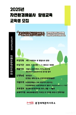 (ÀÚ¿¬È¯°æÇؼ³»ç ¾ç¼º±³À°)¹®°æ»õÀç°ü¸®»ç¹«¼Ò(¼ÒÀå ¹®»ó¿î) ÀÚ¿¬ »ýŹڹ°°ü¿¡¼­ 2025³â ÀÚ¿¬È¯°æ ÇØ¼³»ç ±âº» ¾ç¼º°úÁ¤ ±³À°´ë»óÀÚ¸¦ 3¸í Ãß... [¹®È­] õ±Ý·® 2025-07-24 13:00